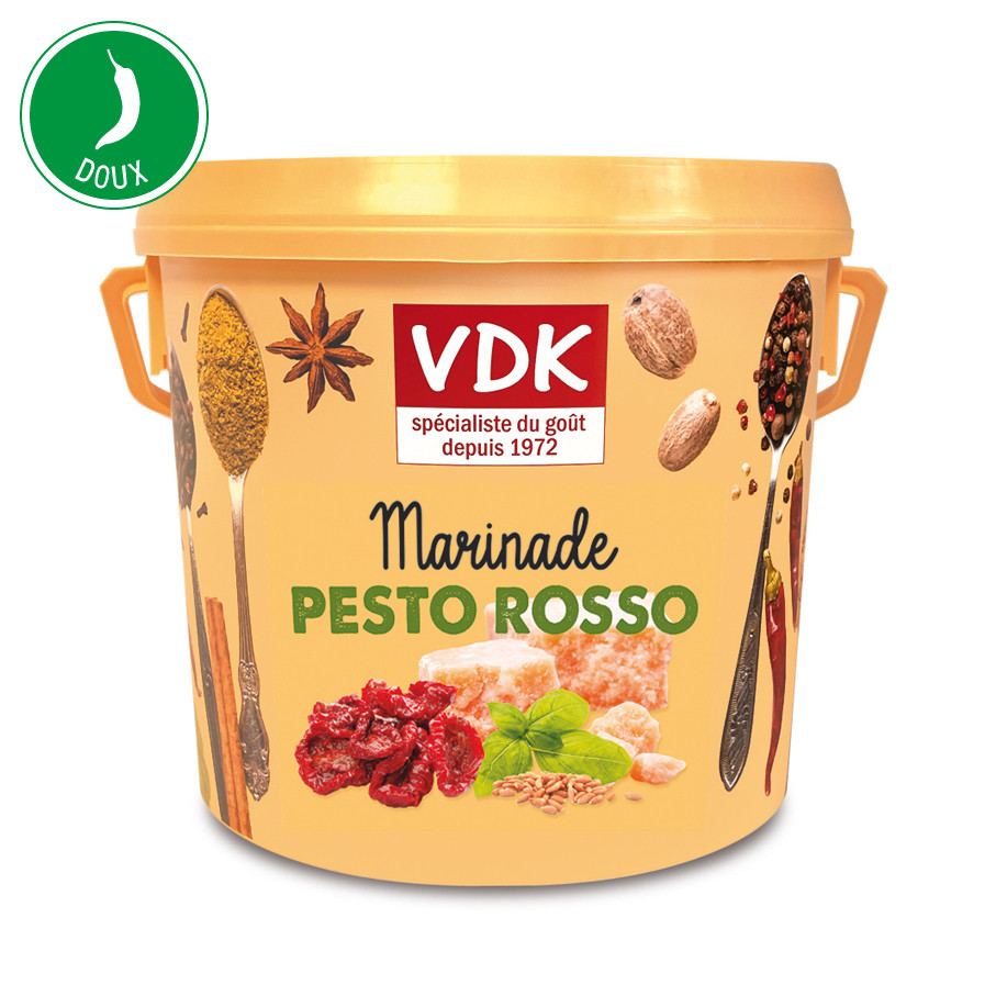 Le Pesto Rosso est une marinade d’inspiration méditerranéenne, élaborée autour de la tomate séchée, de l’huile d’olive vierge extra, des plantes aromatiques et des épices. Son goût riche et ensoleillé apporte une vraie personnalité aux préparations tout en restant facile à apprécier.