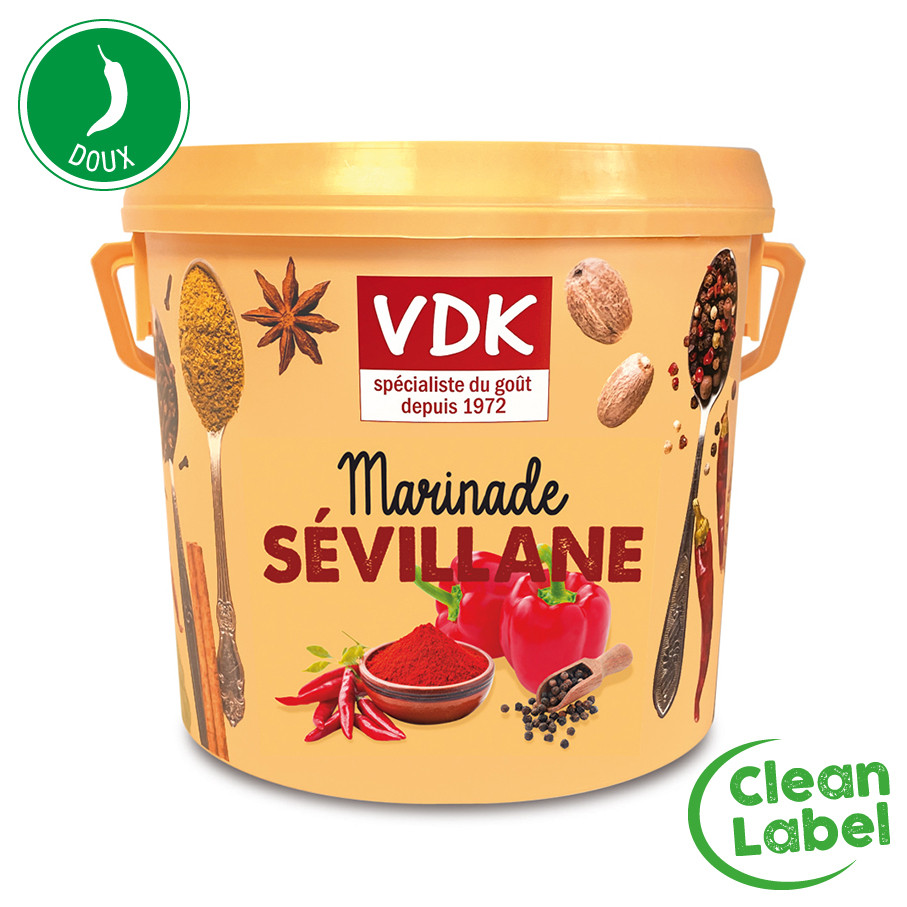 La Sévillane est une marinade au tempérament généreux, inspirée des saveurs du Sud. Son mélange d’épices, de poivron, de paprika, de piment et de muscade apporte une saveur chaude, parfumée et légèrement relevée qui met en valeur vos préparations.
