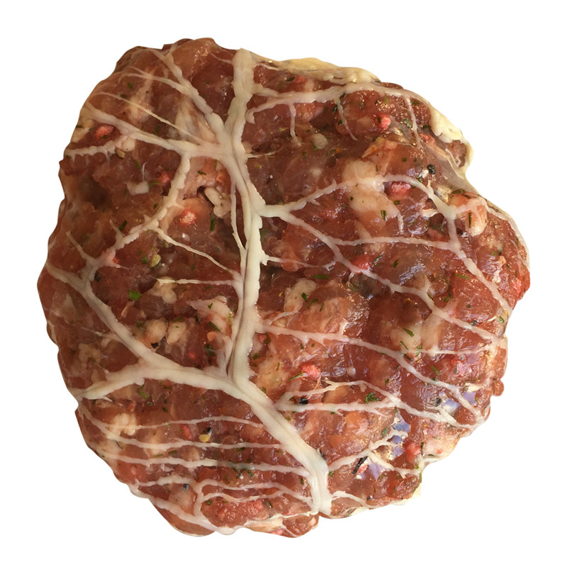 Mêlée : 20% maigre de bœuf, 25% poitrine de porc, 50% épaule de porc, 5% eau.